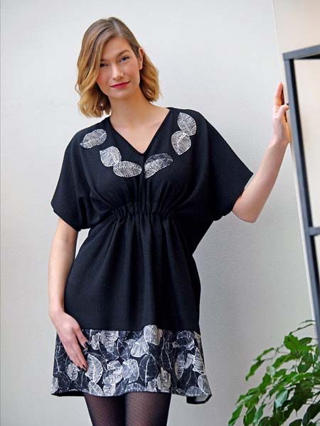 Zanimljiv model s V izrezom i gumom koja dolazi visoko u struk savršeno smanjuje veća prsa i prekriva bokove. Možete ga nositi samostalno (u kombinaciji s kardiganom) ili uz dolčevitu i majicu koju nosite ispod.