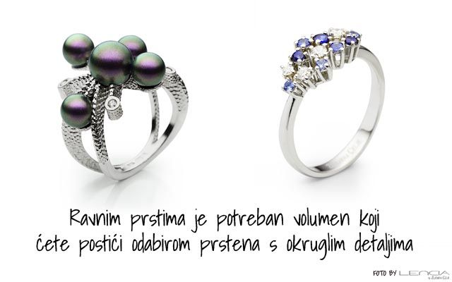 • Okrugli ili „kobasičasti” prsti najčešće djeluju deblje i ni malo ženstveno (posebno ako su na njima i mali četvrtasti nokti). Kakav ćete prsten odabrati? Tanji prsten s dominantnim ukrasom (poput četvrtastog, trokutastog oblika), ali i kombinacije prstena koji su ove sezone hit – jedan na donjem dijelu prsta i drugi na gornjem članku. Imate li izrazito kratke prste odaberite kamen poput ovala koji će učiniti da kratki prsti izgledaju dulji.