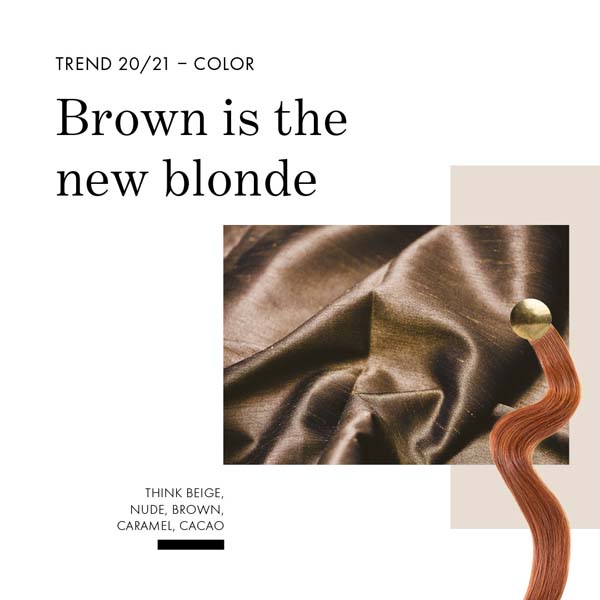 Prirodna boja kose bit će sve popularnija. Ona je savršena baza za stvaranje suptilnih pramenova, koji će na najbolji način istaknuti njezinu prirodnu ljepotu. Naglasak je na ljupkim svjetlijim i tamnijim nijansama smeđe boje – kremasta, nude, topla karamela, duboka boja kave i kakaa – s naglaskom na minimalnom održavanju i zdravom sjaju.