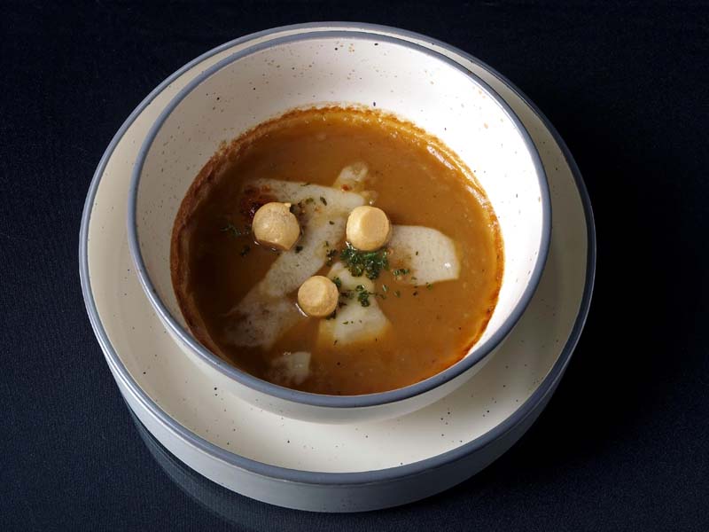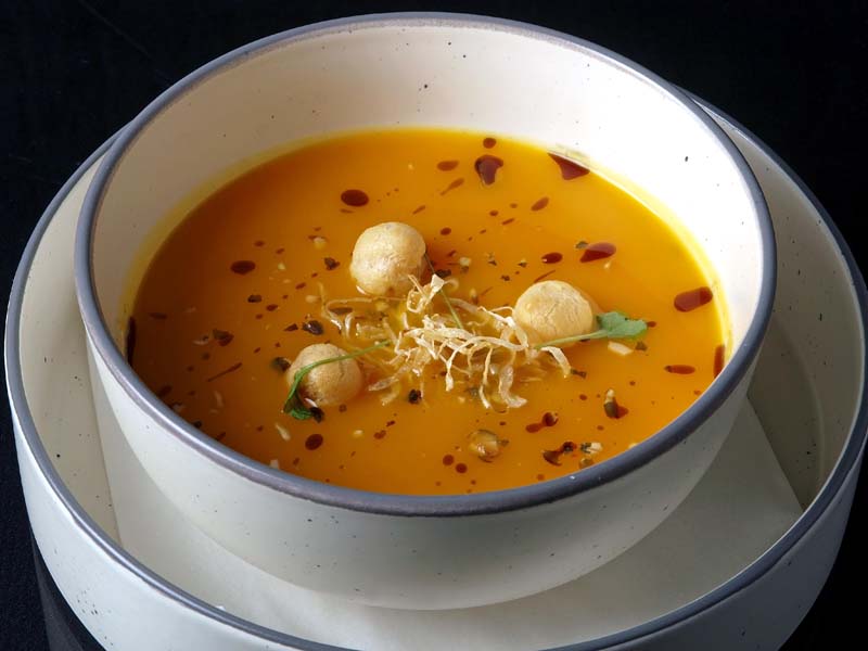 Glavni dio menija počinje se s juhom, a mi se nismo mogli odlučiti koju naručiti, pa su na stol stigle obje: krem juha od buče i zapečena juha od luka zapečena s grana Padano sirom. Za mnoge je juha od buče bila najbolja koju su do sada kušali, a juha od luka je bila iznenađenje. I ovdje se vidio mali pomak u razmišljanju kako pripremiti klasična jela: savršen okus dobro poznate juhe imao je potpuno drugačiju strukturu, a dodatno iznenađenje bili su kuglice od tijesta od kojeg se inače rade profiteroli.
