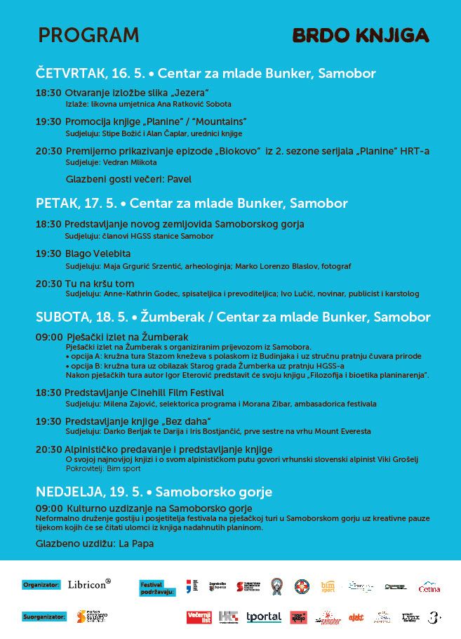 Nakon odličnih najavnih programa u knjižnicama Zagreba i Karlovca u travnju, glavni program festivala “Brdo knjiga” u svibnju se treću godinu zaredom održava u Samoboru i Parku prirode Žumberak – Samoborsko gorje. Od četvrtka 16. do nedjelje 19. svibnja Samoborce i njihove goste očekuje raznovrstan program nadahnut planinama: predstavljanja knjiga i razgovori s autorima, izložbe, radionice za djecu i odrasle, izleti, prodajna izložba knjiga, glazbeni nastupi i ekskluzivni sadržaji. Organizator festivala, izdavačka kuća Libricon iz Zagreba i Pučko otvoreno učilište Samobor kao su-organizator pozivaju sve na čitanja u samoborskom Centru za mlade Bunker i hodanja po okolnom gorju, uz najavu da će treće Brdo biti najveće do sad!