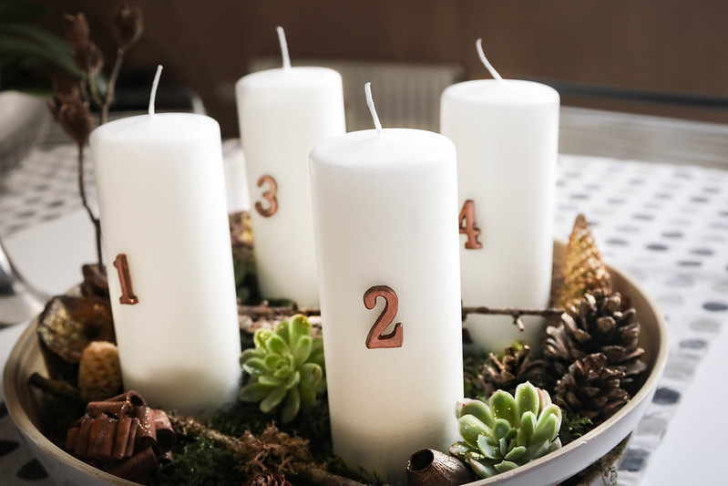 Na kraju je od zimzelena stvoren adventski vijenac koji simbolizira vječni život usred zime. Krug označava Božju beskrajnu ljubav i vječni život, crvena boja koja se koristi za ukrašavanje vjenčića upućuje na Isusovu žrtvu i smrt. Šišarke mogu simbolizirati novi život… Najčešći običaj adventskih svijeća uključuje četiri svijeće. Svake od četiri nedjelje prije Božića pali se nova svijeća. Svaka svijeća predstavlja nešto drugo, iako se tradicije razlikuju. Četiri svijeće tradicionalno predstavljaju nadu, vjeru, radost i mir. Često su prva, druga i četvrta svijeća ljubičaste; treća svijeća je ružičasta. Ponekad su sve svijeće crvene, ali i plave ili bijele.