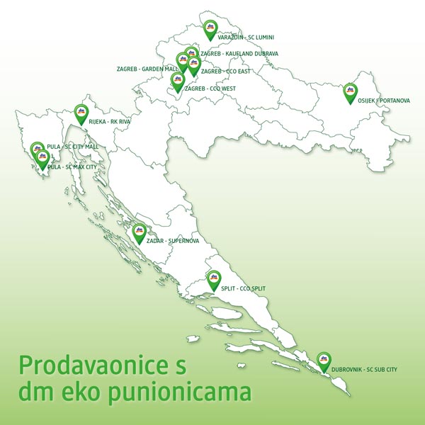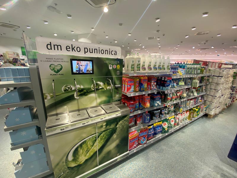 U prodavaonicama dm-a u Zagrebu, Splitu, Osijeku, Rijeci, Zadru, Varaždinu, Puli i Dubrovniku kupci od sada mogu kupovati još osvještenije, zahvaljujući dm eko punionicama koje omogućuju ponovno punjenje boca tekućim deterdžentima Planet Pure BIO.