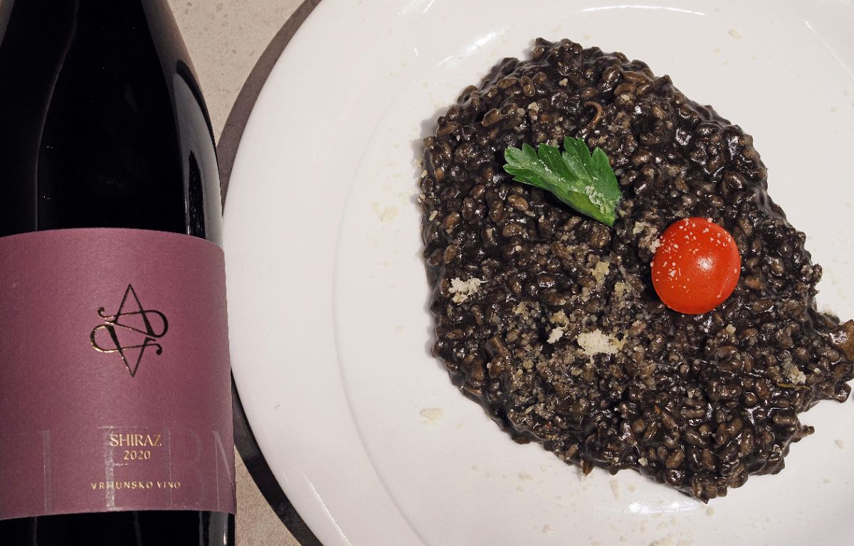 Prijelaz na jaču hranu i vina označili su Crni rižoto s plodovima mora i Velebna Shiraz 2020, iz novije vinarije smještene u Poličniku, u Ravnim kotarima kod Zadra. Enolog Martin Kovačević predstavio je vino od ove poznate internacionalne sorte koja se odlično ‘primila’ u zadarskom zaleđu. Naziv vinarije inspiriran je planinom Velebit, prema kojoj su okrenuti vinogradi, što utječe na stilistiku vina. Zato su ona svježa i pitka iako dolaze iz srca Dalmacije. Shiraz je najprije boravio u inox bačvama, a potom je kratko izložen u drvenim bačvama i onda mirovao u bocama. Rezultat je vrlo pitko i sočno vino s aromama bobičastog voća. Vinarija Velebna godišnje proizvodi, iz vlastitih vinograda, Chardonnay, Merlot, Shiraz i Rose od shiraza u količinama od 50.000 butelja i plasira po odabranim restoranima, wine shopovima i delikatesnim prodavaonicama. Shiraz se za stolom pokazao kao odlična pratnja crnom rižotu i uz maslinovo ulje Buža, koje nije prejako te je usklađene gorčine i pikantnosti.