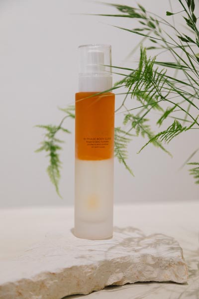 Jedan od ključnih aktivnih sastojaka regenerirajućeg Bi-Phase Body Elixira je ručno rađeni macerat organske mrkve upotpunjen umirujućim i osvježavajućim esencijama divlje branog matičnjaka i mente te prirodnim hidratizatorima, poput gela crvene alge i fitoskvalana dobivenog iz maslina. Bi-Phase Body Elixir je najbolji odabir za njegu devitalizirane, blijede, suhe i zrele kože koju umiruje, obnavlja, vraća joj vlažnost, svježinu i zdravi sjaj. Zbog bogatstva beta karotena, uchka eliksir je sjajan za pripremu kože tijela prije sunčanja kao i nakon njega, jer štiti kožu od oksidacijskih oštećenja, sprečava reakcije fotoosjetljivosti i pomaže pri zdravom tamnjenju.