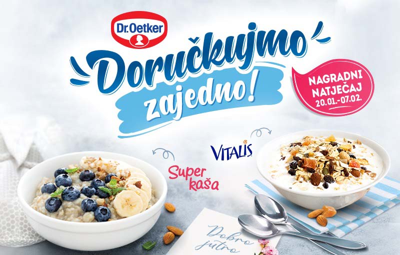 Dr. Oetker svojim brojnim ukusnim i hranjivim proizvodima kontinuirano podsjeća na važnost zdravih i cjelovitih namirnica za doručak. Kako bi dodatno naglasili da je upravo kvalitetan jutarnji obrok nužan za dobro funkcioniranje organizma čitav dan, iz Dr. Oetkera predstavljaju novu kampanju pod nazivom Doručkujmo zajedno, a u kojoj ističu svoje Vitalis i Super kaša proizvode kao idealne hranjive doručke za cijelu obitelj.