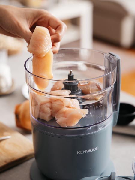 Priprema je brza i jednostavna. Za početak pileći file nasjeckajte na komade i, radi lakšeg miksanja, stavite pola sata u zamrzivač.