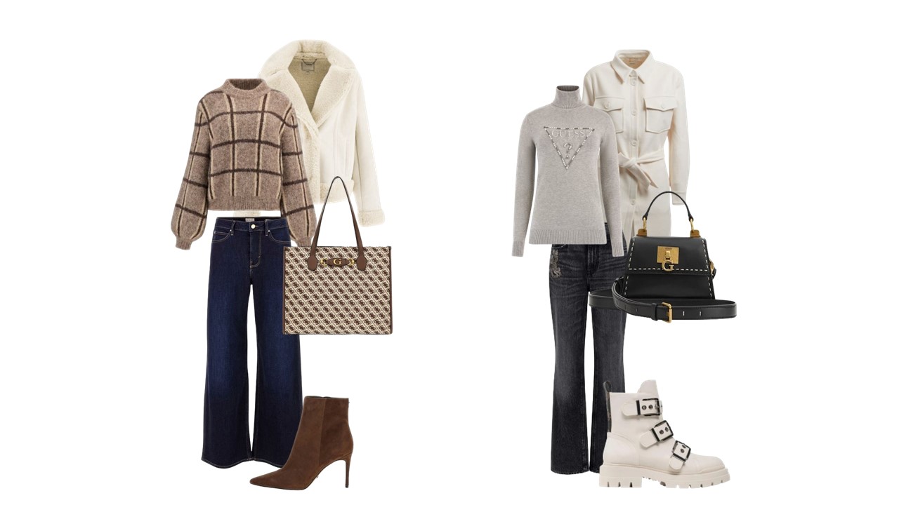 Kad su u pitanju traperice, Guess nudi veliki izbor raznih modela s pomoću kojih ćete kreirati odlične kombinacije. Odaberite sve popularnije široke traperice za nešto opušteniji look, uz smeđi džemper s uzorkom zbog čega vam neće trebati nakit. Outfit upotpunite toplom jaknom i elegantnim gležnjačama na visoku petu. Za neobavezne šetnje gradom odlična opcija su chunky bijele gležnjače s kopčama koje možete kombinirati s tamnom sivim trapez trapericama. Guess dolčevita s logotipom i bijeli kaput na vezanje cijeloj kombinaciji dat će profinjeniju notu, a mini torbicom s ručkom