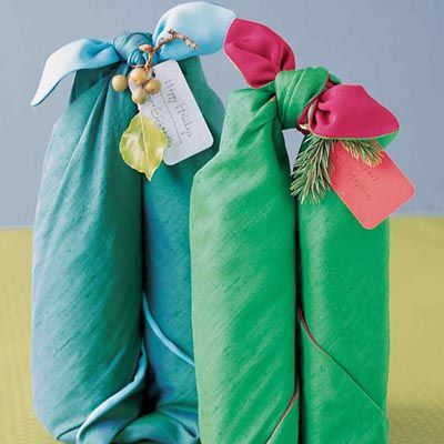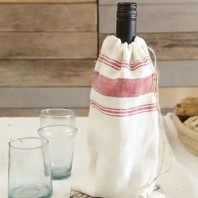 • U običnu kuhinjsku krpu možete zapakirati dvije boce i međusobno ih povezati u slatku mašnu. Uz to, odaberite ukrasne krpe koje će se uklopiti u kuhinju domaćice.