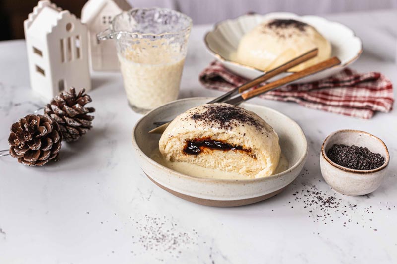 7. U zdjelici pomiješajte mak i bourbon vanilin šećer. Prebacite kuhane germknedle u zdjelice, prelijte ih umakom od vanilije, posipajte makom i poslužite.