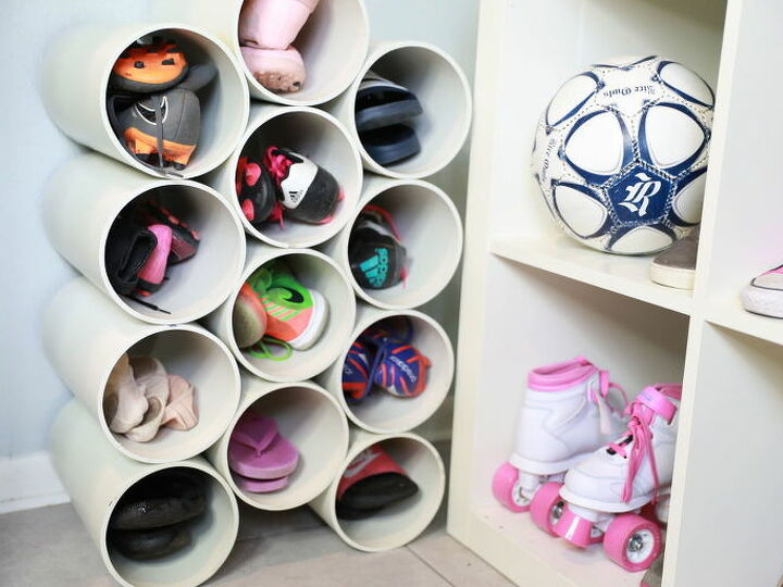 Nosite li ravnu obuću napravite policu od jednako skraćenih plastičnih cijevi. Možete je napraviti sami, materijal je jako jeftin, a tuljci su odlično rješenje za pohranjivanje bez dodavanja volumena.