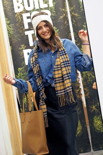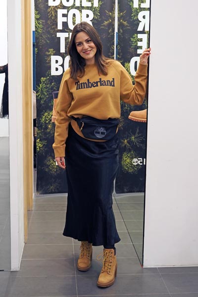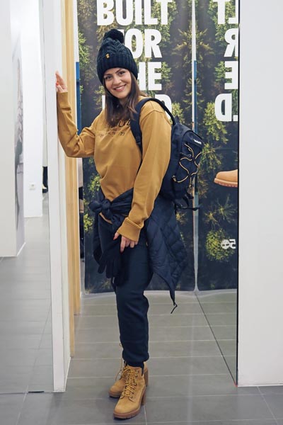 Žuta čizma je prepoznatljive boje senfa koja je u zimskim outifitima pravo modno osvježenje. U ovom total looku stilistica boju provlači kroz nekoliko modnih detalja koji stavljaju u drugi plan temeljne odjevne predmete – suknju i finu mekanu Timberland košulju. U aktualnoj zimskoj kolekciji, Timberland u fokus stavlja i mnoge modne detalje – šalove, kape ili ukrasne trake poput ove koju nosi Antonija.