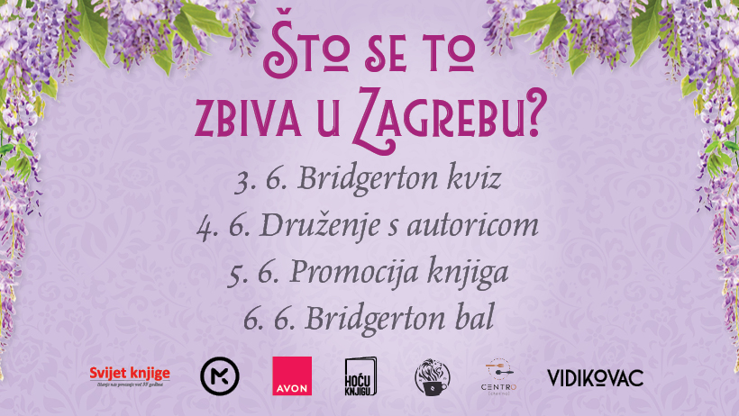 Julia Quinn, maestralna autorica koja je očarala čitatelje diljem svijeta svojim romantičnim sagama, dolazi u Zagreb. Za ljubitelje romansi, zabranjenih ljubavi, plemenitaških tračeva i povijesnih drama, to će biti tjedan koji se ne propušta. Očekujte niz događanja koji će vas odvesti u svijet Bridgertona, prepun skandala, tajni i romantičnih zapleta. Svaki će događaj oživjeti stranice njezinih romana. Sponzori i partneri bez kojih ova čarolija ne bi bila moguća su Avon, Hoću knjigu, Kavana Lav, Centro restoran, CCO East te Caffe Bar Vidikovac.