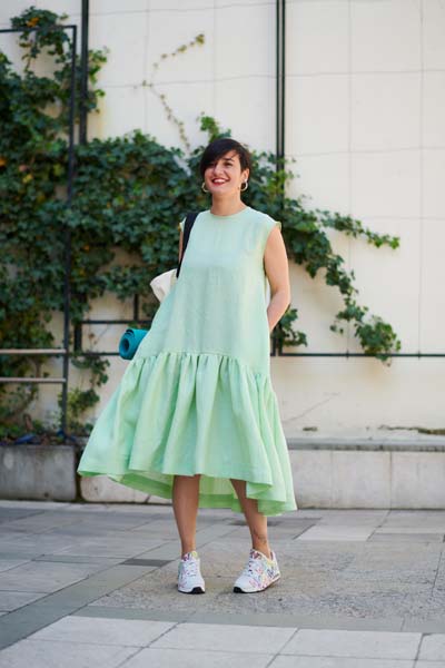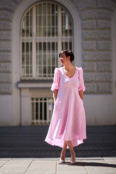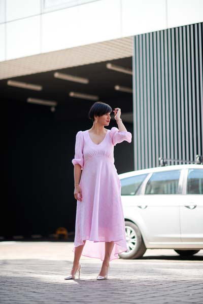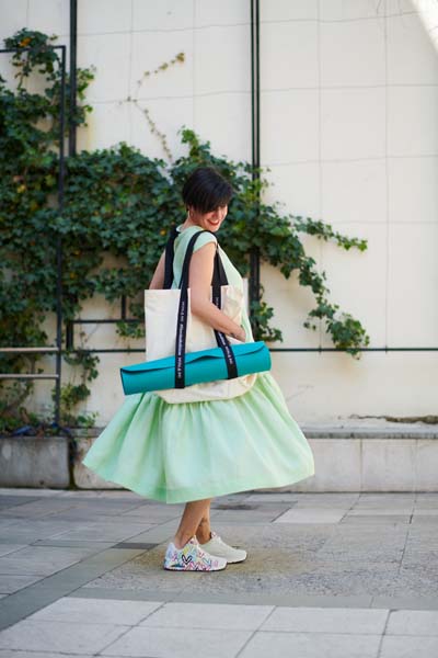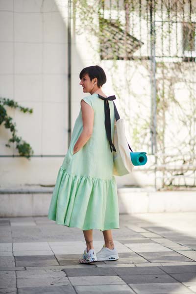 U ovoj mini kolekciji za mame su dvije krasne lanene haljine s detaljem u obliku volana. Dolaze također u ružičastoj te u boji mente, a tu je i jedna praktična platnena torba velikih dimenzija, s držačem za prostirku za vježbanje koja joj daje dodatnu dimenziju funkcionalnosti.