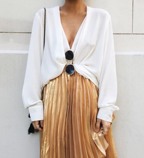 - u total looku u boji zlata neka bude najdominantniji odjevni predmet uz kojeg ćete kombinirati neutralne odjevne predmete (dobar primjer je zlatna suknja i bijela majica) . Dodajete li total looku i zlatni modni detalj neka bude u istom intenzitetu kao odjeća.