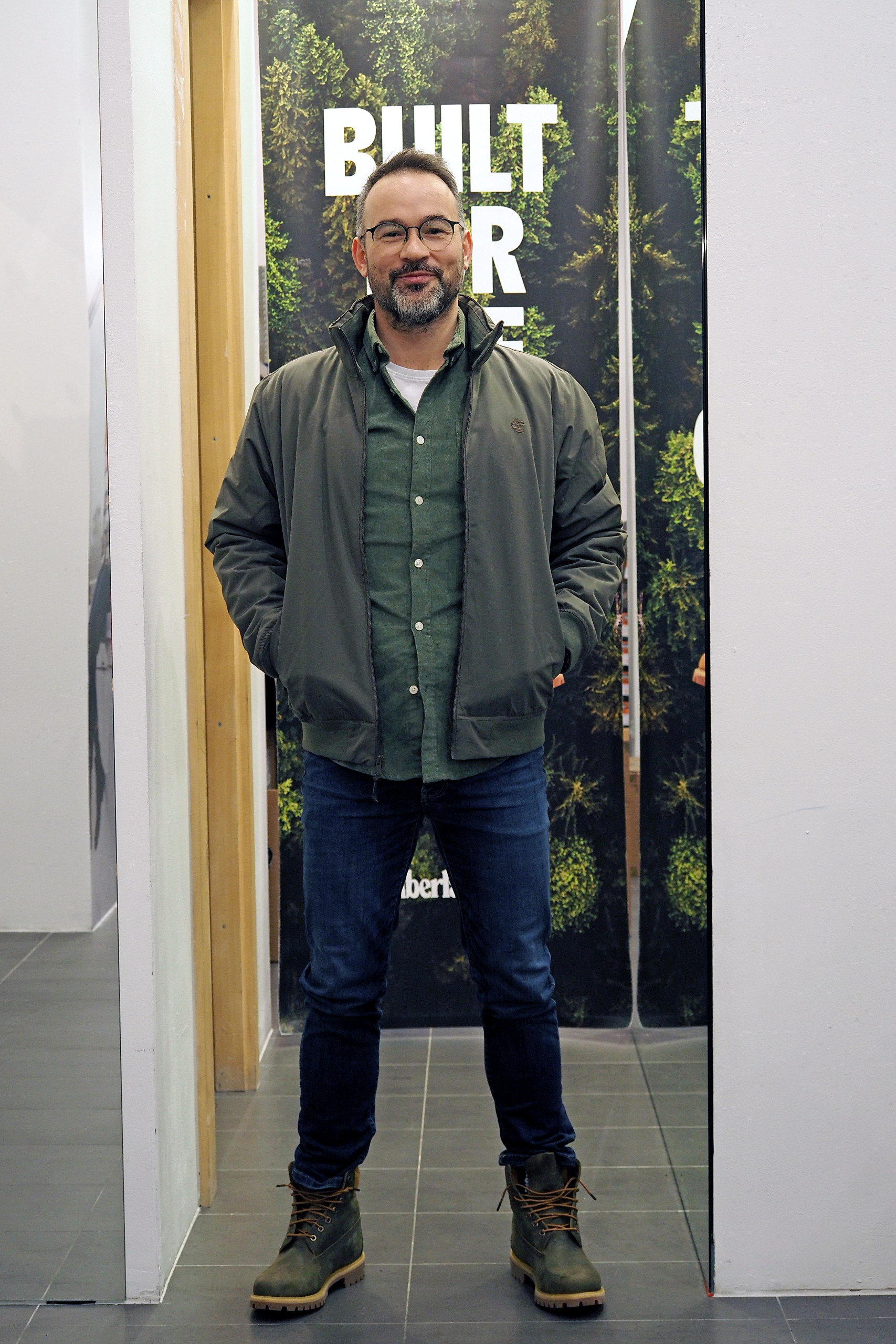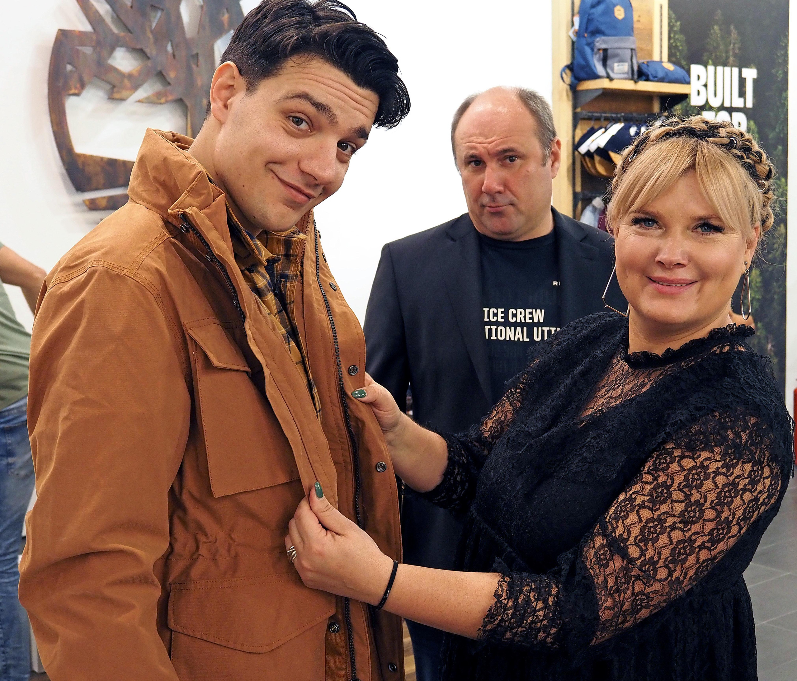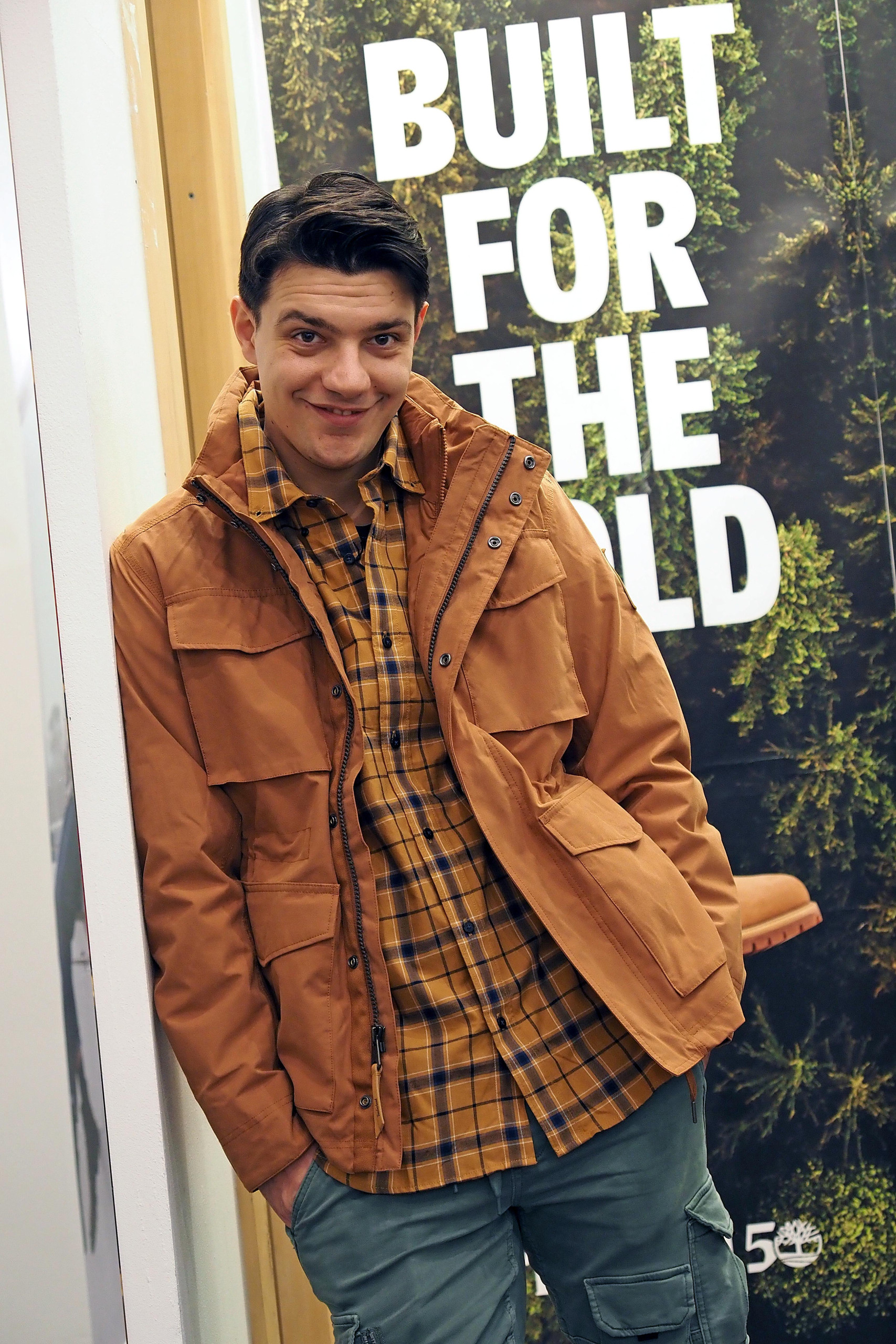 Mladi glumac Vedran Dakić ljubitelj je aktualnih modnih trendova. Kombinira različite stilove, voli novitete ali i funkcionalnost. Zato je Alma uz funkcionalne cargo hlače kombinirala vrlo nosivu kariranu košulju (po potrebi se može dodati i pulover) povezujući modni detalj sezone – popularne Timberland gležnjače’ s jaknom iste boje. Upravo ta boja cigle koja u isto vrijeme koketira sa smeđom ali i bojama iz crvenog spektra na poseban način daje svježinu licu.
