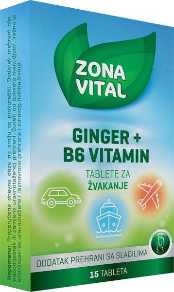 Dobro je sa sobom uvijek imati Zona Vital GINGER + B6 vitamin tablete za žvakanje. One sadrže đumbir, koji doprinosi normalnoj funkciji probavnog sustava i vitamin B6, koji doprinosi smanjenju umora i iscrpljenosti te regulaciji hormonske aktivnosti.