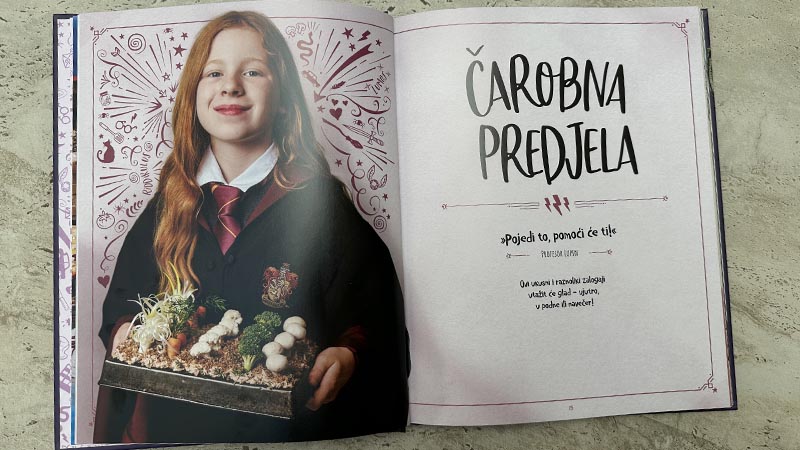 „Mnogi su ljubitelji Škole vještičarenja i čarobnjaštva Hogwarts čeznutljivo zamišljali okus hrane koju su Harry, Hermiona i Ron jeli u Velikoj dvorani. Više ne moraju maštati! Zahvaljujući receptima, korisnim savjetima i podsjetnicima na detalje iz filmova, objavljenima u ovom bestseleru New York Timesa, moguće je gozbu iz Hogwartsa prirediti u vlastitu domu. Osim recepata, čitateljima su potrebni Hermionin oštar um, Harryjeva glasovita hrabrost i Ronova slavna ljubav prema hrani. Sretno s čarolijom kuhanja!”, poručuje urednica knjige Miroslava Vučić.