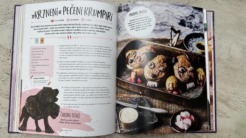 Svako jelo u ovoj knjizi nadahnuto je filmovima o Harryju Potteru. Primjerice, Juha Napadačke vrbe ima vitice tikvica i kupusa slične nasilnim granama koje najviše pamtimo iz prizora kada napadaju Harryja, Rona i leteći automobil u Harryju Potteru i Odaji tajni. S dna voćnog napitka Gruvaličin gutljaj vreba vodeni zloduh, sličan neugodnim malim stvorenjima u filmu Harry Potter i Plameni pehar. Bez brige, u napitku su gruvalice od kruške!