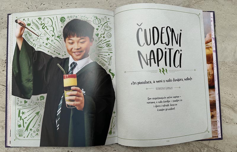 Uz neodoljive slastice kao što su Dumbledoreov čarobni limunski nabujak, Đavolja pita s jabukama i puslice u obliku snježne sove Hedwige, čitatelji će uživati u maštovitim i osvježavajućim voćnim napitcima,među kojima su i Sasvim fine trolove bale.
