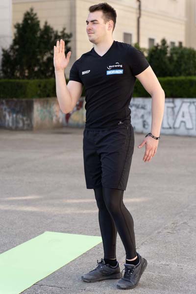 Iz paralelne pozicije iskoračite jednom nogom prema naprijed te isto kao u prethodnoj vježbi nemojte dozvoliti koljenu da odlazi previše prema naprijed i unutra. Vježbu izvedite kroz 2 serije po 5 puta svaka noga.