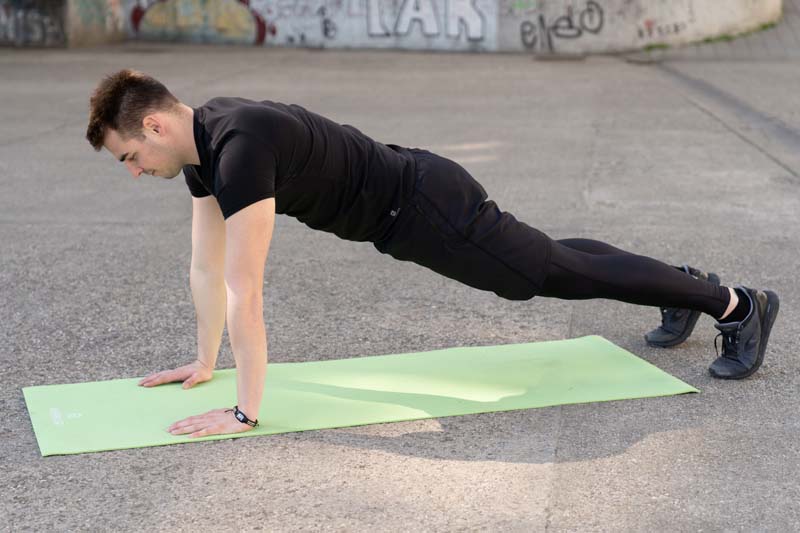 Tijekom izvedbe skleka aktivirajte mišiće stražnjice i trupa te ne dozvolite kukovima da propadaju prema dolje. Ukoliko kukovi propadaju prema dolje ili vam je teško, olakšajte si izvedbu tako da spustite koljena na podlogu. Sklek izvodite kroz 2 serije po 8 ponavljanja.