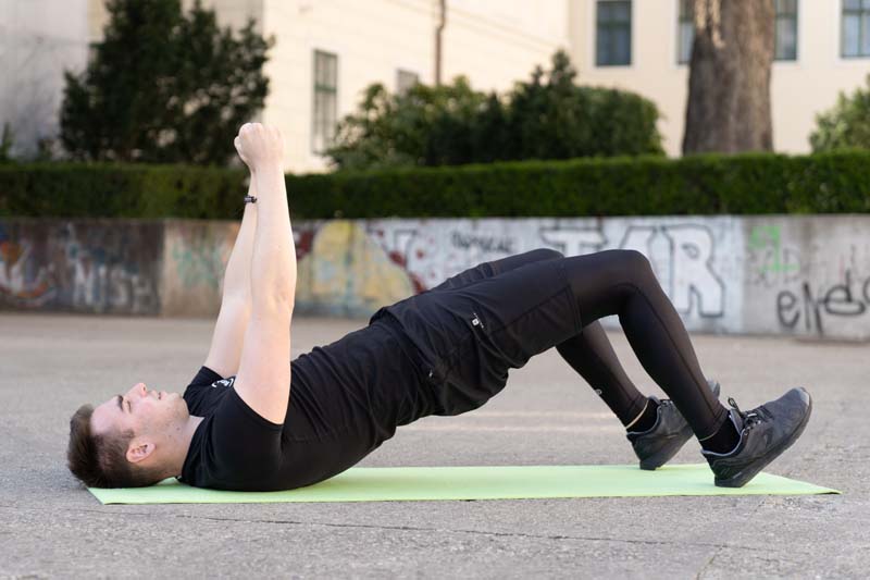 U poziciji ležanja na leđima noge savijte u zglobu koljena pod 90 stupnjeva te ruke pružite ispred tijela i stisnite obje šake. Iz navedene pozicije potisnite kukove prema gore te aktivirajte mišiće stražnjice. Vježbu ponavljajte u umjerenom tempu kroz 10 ponavljanja.