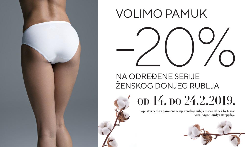 Za sve one koje vjeruju samo pamuku, ali i Lisca pamuku stiže dobra vijest. Sve do 24.Veljače traje akcija ”Volimo pamuk” tijekom koje ostvarujete popust od 20% na svaki Lisca pamučni komad koji kupite.