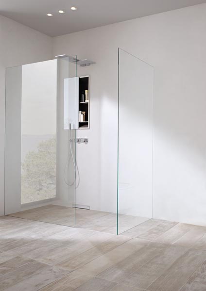 Tuš kada ugrađena u razini poda s walk-in tuš panelom bez vrata koji prati rub tuš kade cijelom duljinom. Što je panel dulji, veća je površina zaštićena od prskanja.