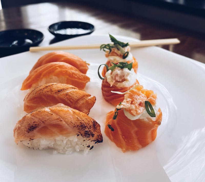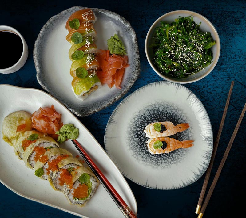 - Maki sushi s lososom i avokadom: Na nori namažite tanki sloj sushi riže, zatim stavite trakice lososa i avokada. Zarolajte pomažući se rolo-matom, režite na šest do osam dijelova i poslužite s wasabijem i soja umakom.