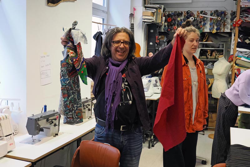 U radionicu su nas uvele Ana i Kaja – dvije kreativke koje su nas odmah opustile i uvele u proces bez imalo treme. Njihov pristup je jednostavan: nema pravila, nema stresa, samo kreativnost i igra. Radionica je počela s odabirom materijala. U skladu s filozofijom održivosti, birali smo reciklirane tkanine koje su već imale svoju priču. Zatim smo krenuli u osmišljavanje dizajna. Kakvu majicu želimo? Koji kroj? Koja kombinacija boja? Uz pomoć Ane i Kaje, ideje su se brzo pretvarale u konkretne planove.