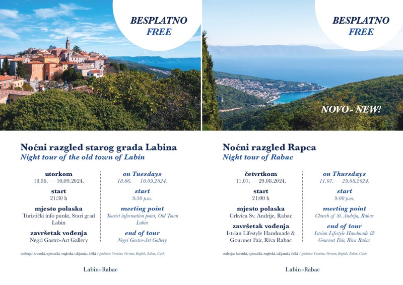 Noćni razgled Starog grada Labina održava se svakog utorka s početkom u 21:30, zaključno s 10. rujnom. Ova besplatna tura na pet stranih jezika uključuje i degustaciju maslinovog ulja lokalnih maslinara u Art gastro galeriji Negri, što će dodatno doprinijeti stvaranju nezaboravnog doživljaja za sve posjetitelje.