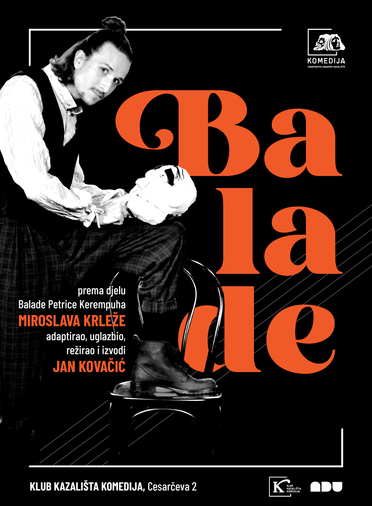 Koristeći svoje pjevačke, sviračke i lutkarske vještine, Jan Kovačić, od siječnja 2024. stalni član glumačkog ansambla Kazališta Komedija, na pozornicu donosi Krležine Balade na sasvim inovativan način. Sigurni smo da će svojom izvedbom pokazati svu raskoš svojih brojnih talenata te svojom predstavom obogatiti repertoar Kluba Kazališta Komedija.