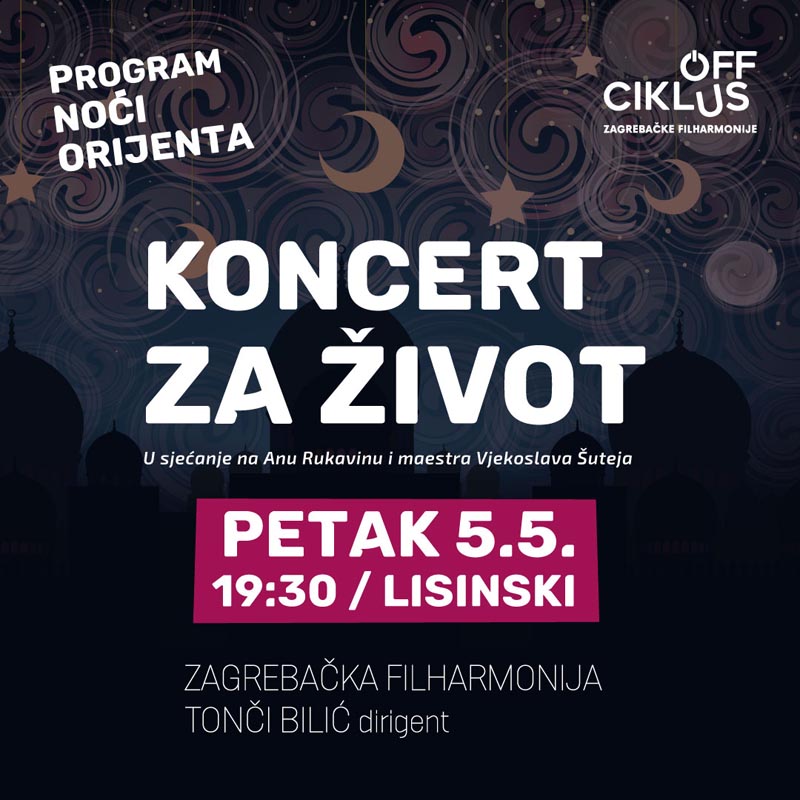 Off ciklus Zagrebačke filharmonije nastavlja se u petak 5.5. Koncertom za život u sjećanje na Anu Rukavinu i maestra Vjekoslava Šuteja. Koncertno-plesna večer pod nazivom Noći Orijenta održat će se u Koncertnoj dvorani Vatroslava Lisinskog s početkom u 19:30 sati.