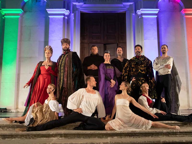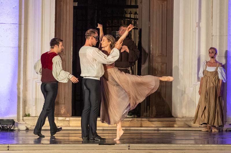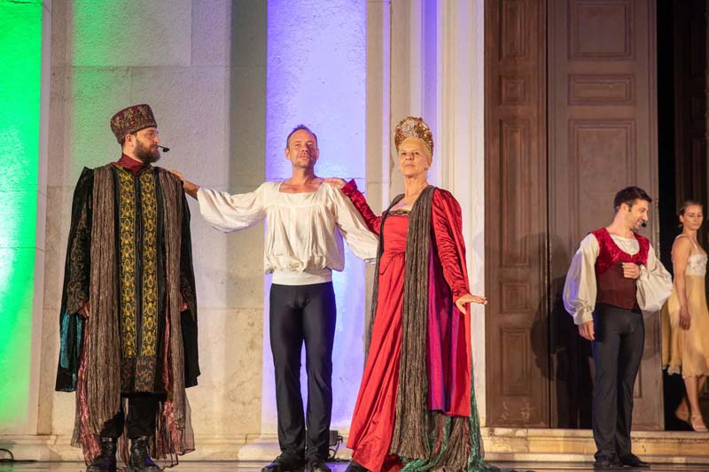 Kao perjanica ovogodišnjeg izdanja istaknula se spektakularna premijera koreodrame ‘Romeo i Julija’, prema prijedlogu Williama Shakespearea, na glazbu P.i Čajkovskog, koja je sinoć premijerno uprizorena pred velebnom crkvom svete Eufemije. Koreografiju predstave potpisuje slavni hrvatski koreograf Dinko Bogdanić, a dramaturgiju Maja Šoljan. Ansambl Opere b.b. u koprodukciji s INk Pula je još jednom pokazao da se može nositi s velikim produkcijama i novim formama. Nakon brojnih opera i opereta ovaj su se put upustili baletnu formu. U zanosnim stilskim kostimima Ike Škomrlj i Dijane Kose Bourek u prilagodbi Barbare Bourek, svi su izvođači izgledali nadahnuto i na kratko nas odveli u neko drugo minulo vrijeme. Romea i Julije su interpretirali Emil Kuzminski i Mateja Ivanković, koji su u svakom trenutku koreografije izgledali uvjerljivo, a tehnički doveli izvedbu do savršenstva. U dvije interesantne glumačke uloge dadilje i Mercuzia pojavili su se glumci Mila Elegović i Walter Roša. Mila je svojom vizijom dadilje dala i dašak komedije, dok je Roša svojom dramatikom predstavi dao jedan drugačiji dramatičniji karakter. Roditelje Capuleti interpretirali su Ervina Sulejmanova i Ronald Braus. Lik majke je također prikazan na dramatičan i moćan način te je gotovo nevjerojatno s kakvom lakoćom Sulejmanova vlada scenom, dok je Braus bio sigurna podrška u situacijama gdje se to očekivalo, a u dramskim intervencijama bio je suveren i jasan. Roditelje Montecchi interpretirali su Zvončica Vučković i Siniša Galović, također sa točnom dozom dramatike i uvjerljivosti. Tibalda i Parisa su iznijeli Dejan Jakovljević i George Alexandru Baldowin, tehnički precizni, uvjerljivi i scenski močni. Fra Lorenza je na scenu uvjerljivo donio Zvonimir Ivanović.