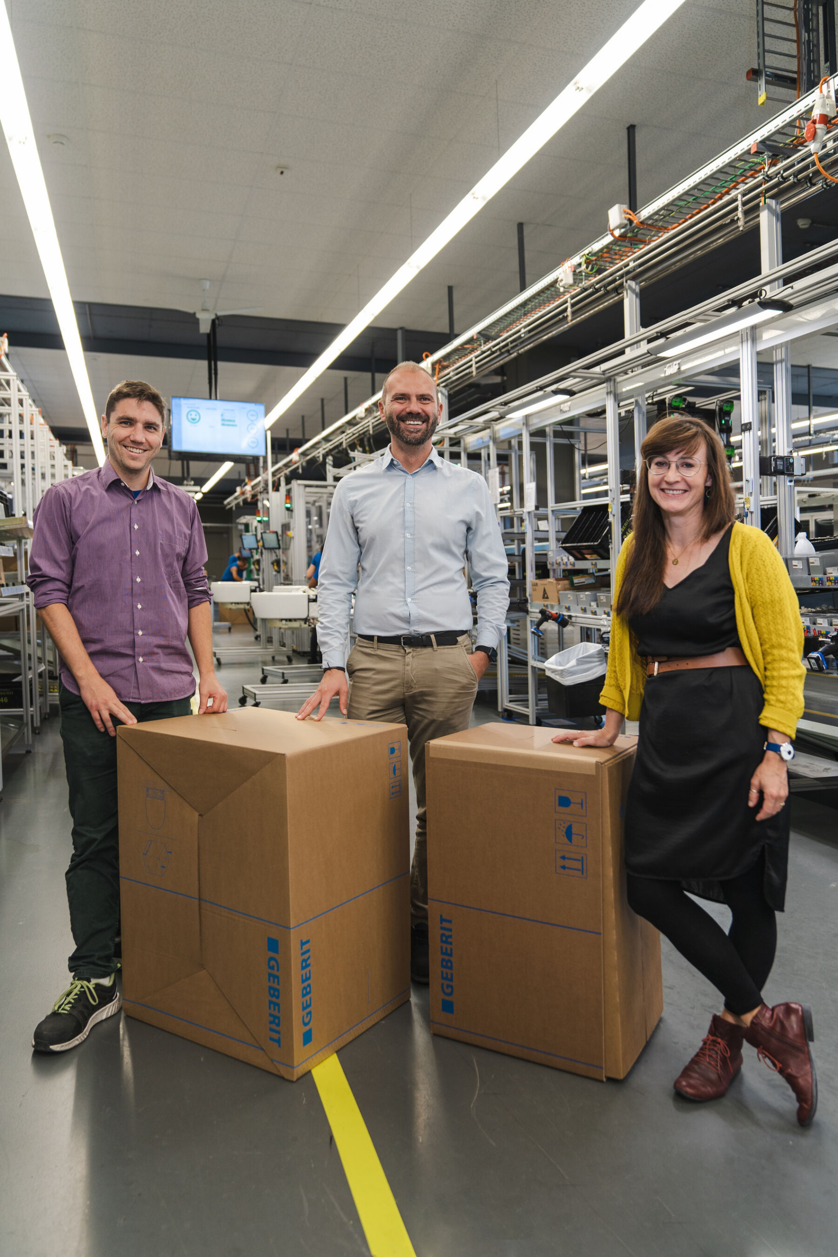Jedno je sigurno: ambalaža štiti proizvode za vrijeme transporta, a Geberit proizvodi dobro su pakirani. Konstanze Smith, inženjerka pakiranja u Geberitu, objašnjava: “Naravno, funkcionalnost pakiranja je najvažnija: proizvod mora doći do kupaca siguran i neoštećen.” Ipak, postavljaju se pitanja poput: Moraju li kutije doista biti tako glomazne? Kolika količina materijala za ispunu je doista potrebna? Zajedno sa Želimirom Blaževićem, voditeljem projekata, i Adrianom Hämmerlijem, voditeljem proizvoda, krenula je u smanjenje veličine ambalaže za tuš WC uređaje Geberit AquaClean Mera i Geberit AquaClean Sela Round.