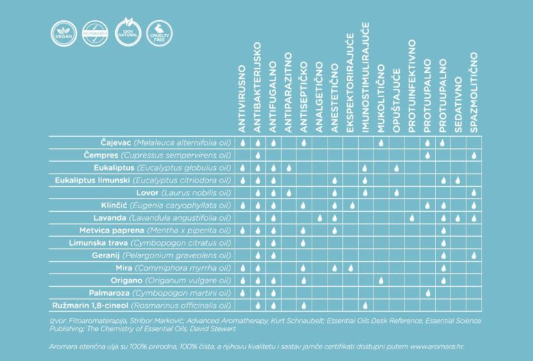 Tražeći ovih dana neka prirodna rješenja za borbu protiv gljivica i bakterija otkrili smo pravu riznicu informacija u Aromari koja je u fokus stavila čak 14 najmoćnijih eteričnih biljaka/ulja s potvrđenim djelovanjem protiv virusa, gljivica, bakterija.