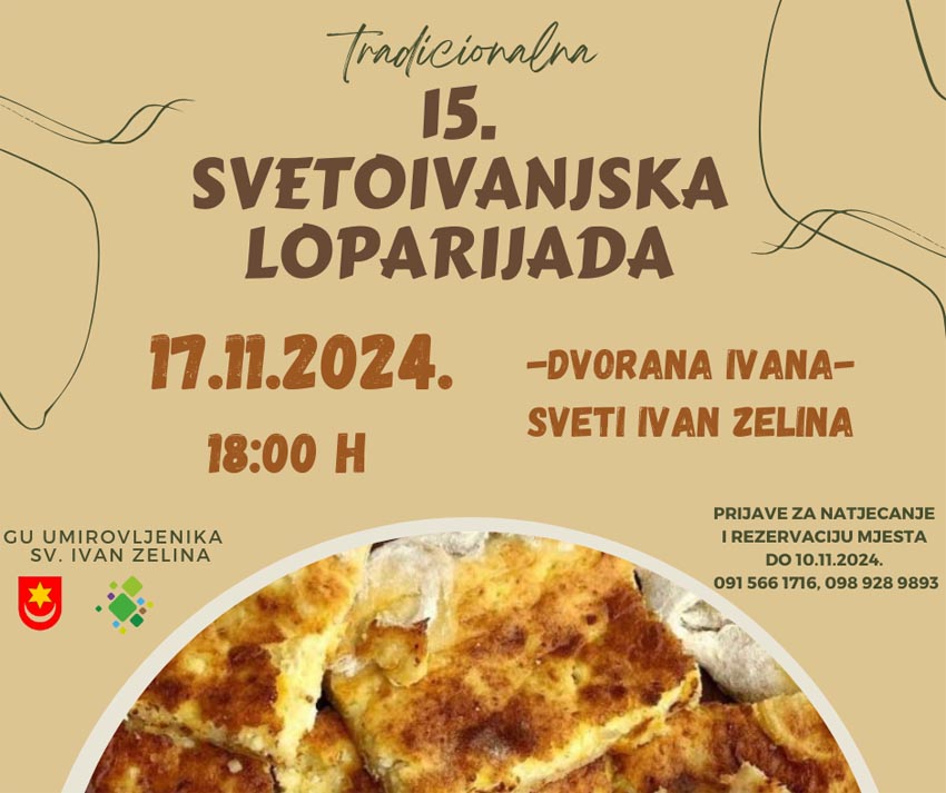 Ovogodišnja 15. Zelinska loparijada održava se 17. studenoga u Dvorani Ivana (Sveti Ivan Zelina, Trg Ante Starčevića 5) s početkom u 18 sati, a rezervacije mjesta se primaju do 15. studenoga na brojeve 091 566 1716 ili 098 928 9893.
