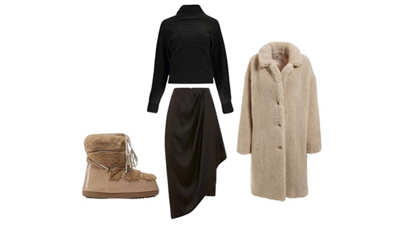 Midi suknja s prorezom u kombinaciji s crnom pletenom dolčevitom idealna je kombinacija odlučite li se za poslovni look. Ako pak želite ovaj outfit malo „ugrijati“, može se kombinirati s teddy kaputom koji je stalni favorit već nekoliko sezona. Topao materijal i jednostavan kroj u bež boji stvara idealan sklad ležernoga i klasičnoga. Od obuće za ovu zimsku sezonu izdvajamo ove udobne smeđe čizme koje će vam pružiti cozy-warm efekt.