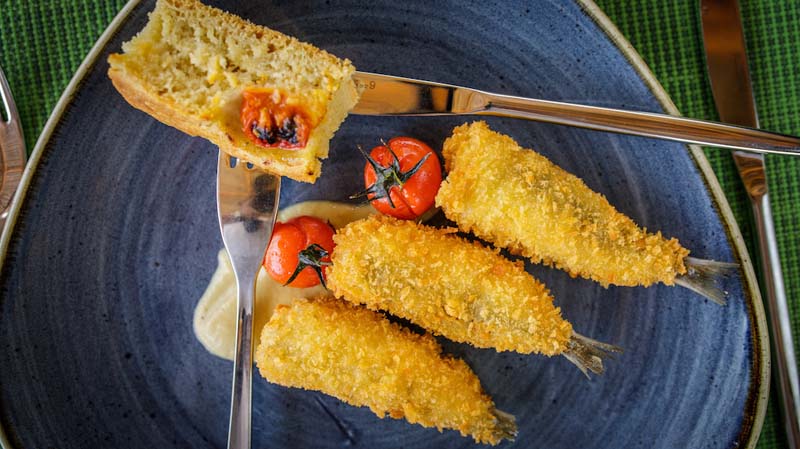Srdele otvoriti na knjigu te puniti tapenadom od zelenih maslina, motara, kapara, inćuna, češnjaka i maslinovog ulja. Napraviti tempuru od oštrog brašna, žumanjka, mineralne vode i malo panko krušnih mrvica. Servirati uz kremu od središnjeg dijela tikvica.