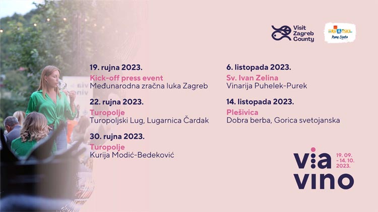 Novo izdanje popularnog VIA VINO festivala donosi spoj glazbe, kulture, umjetnosti i nezaboravnih lokacija Zagrebačke županije, u pratnji finih zalogaja i nagrađivanih vina. Nadomak Zagreba, dalje od gradske vreve prošle se godine tražilo mjesto više, a posjetitelji nisu skrivali oduševljenje konceptom koji je povezao vino s opuštenom atmosferom i autohtonom gastronomijom, ponosom Zagrebačke županije. „Nastojimo svake godine obogatiti program VIA VINA, nagrađivanog festivala posvećenog kulturi vina i stola, ali i zelenom odmoru te povratku prirodi. Nakon prva dva izdanja i rasprodanih VIA VINO događanja, ove godine pozivamo sve dosadašnje i buduće posjetitelje, ljubitelje prirode, istraživanja i gastronomije da nam se pridruže na novim lokacijama uz nikada bogatiji program festivala. Cilj nam je svake godine biti bolji, inovativniji i bogatiji programom i vjerujem da ćemo upravo to ove godine i pokazati. Turističku ponudu potrebno je stalno inovirati, čineći sve naše posjetitelje zadovoljnima. Ove smo godine posebno istaknuli održivu notu svega što radimo, pa ćemo uz lokalnu ponudu ića i pića imati i održivu modu lokalnog modnog dizajnera. Sve što vam treba pronaći ćete u Zagrebačkoj županiji, odmor po mjeri čovjeka.“ poručuje direktorica Turističke zajednice Zagrebačke županije, Ivana Alilović.