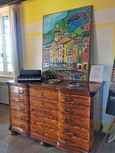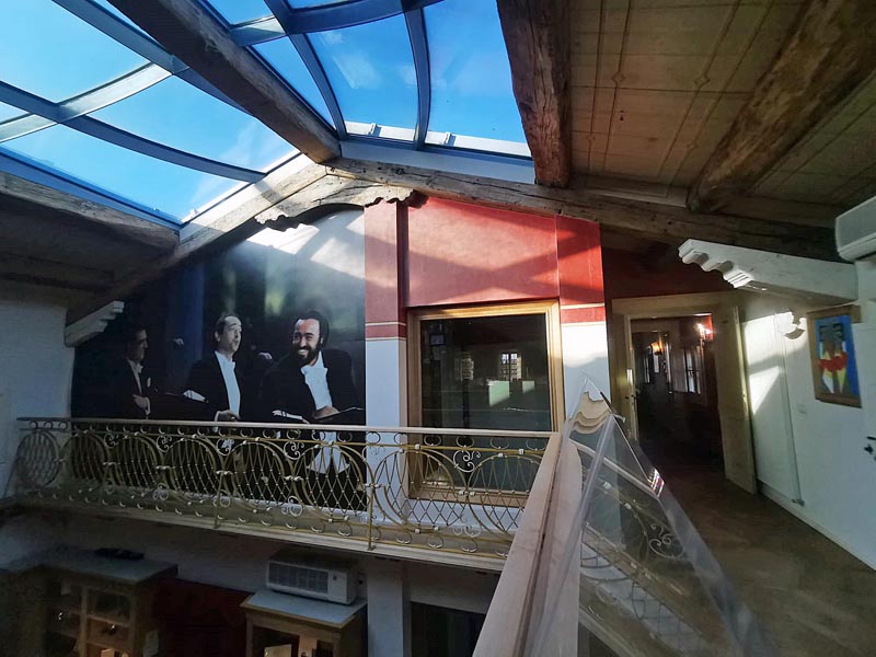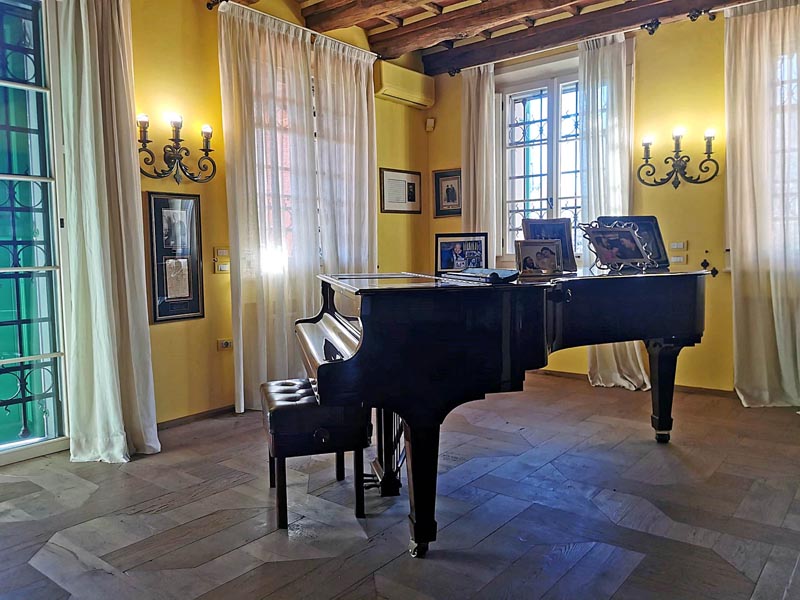 No, vratimo se mi u unutrašnjost kuće. Čim uđete, naći ćete se u velikoj dnevnoj, ali i radnoj sobi u kojoj dominira njegov voljeni klavir, originalno odijelo s frakom, ali i njegov dirigentski štapić kojim je obuzdavao ruke tijekom nastupa. U ovom dijelu dnevne sobe nalaz se i biblioteka i stolić – vitrina u kojoj se nalaze osobni predmeti slavnog glazbenika. Drugi dio dnevne sobe, u kojoj je Luciano okupljao prijatelje povezan je prostranom žutom kuhinjom koja djeluje kao da je vrijeme stalo. Dok ulazite u nju možete zamisliti slavnog tenora kako upravo u njoj kuha čaj koji je redovito pio prije nastupa. Za razliku od prvog dijela dnevne sobe u kojoj osvaja na prvi pogled glazbena karijera ovog glazbenika, u drugom dijelu su otkrivene njegove strasti – u slobodno vrijeme je slikao, a s prijateljima se volio kartati ili pričati skenirajući detalje razgovora.
