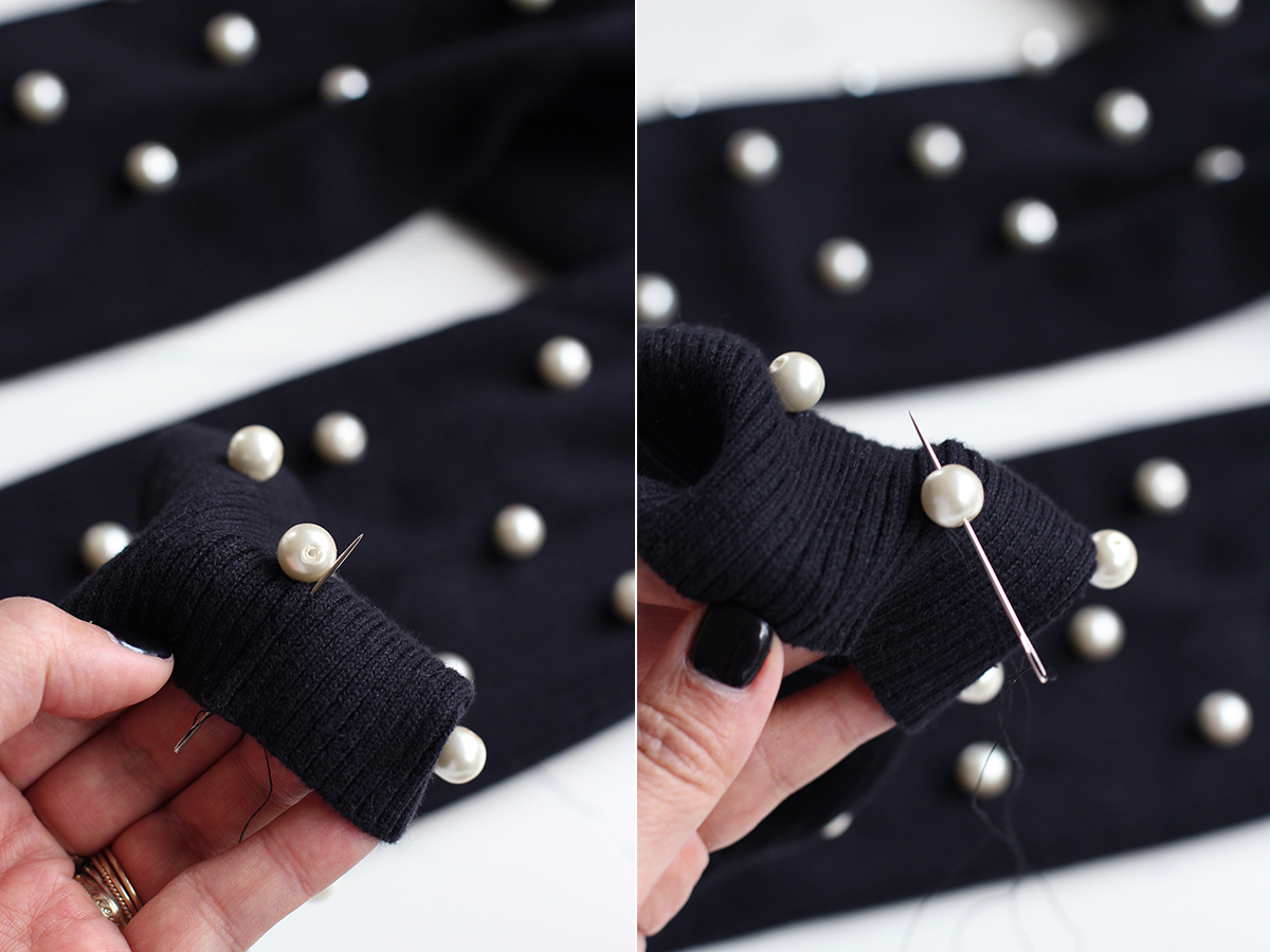 - Pazite na to da perle šivate nekim redom kako bi se stvorila lijepa kompozicija. Način šivanja može biti klasičan (ravnomjerna pokrivenost površine) ali se možete poigrati i neobičnim načinom šivanja- primjerice šivajte oko dubljeg ovratnika, prekrije perlama ramena, rukave…