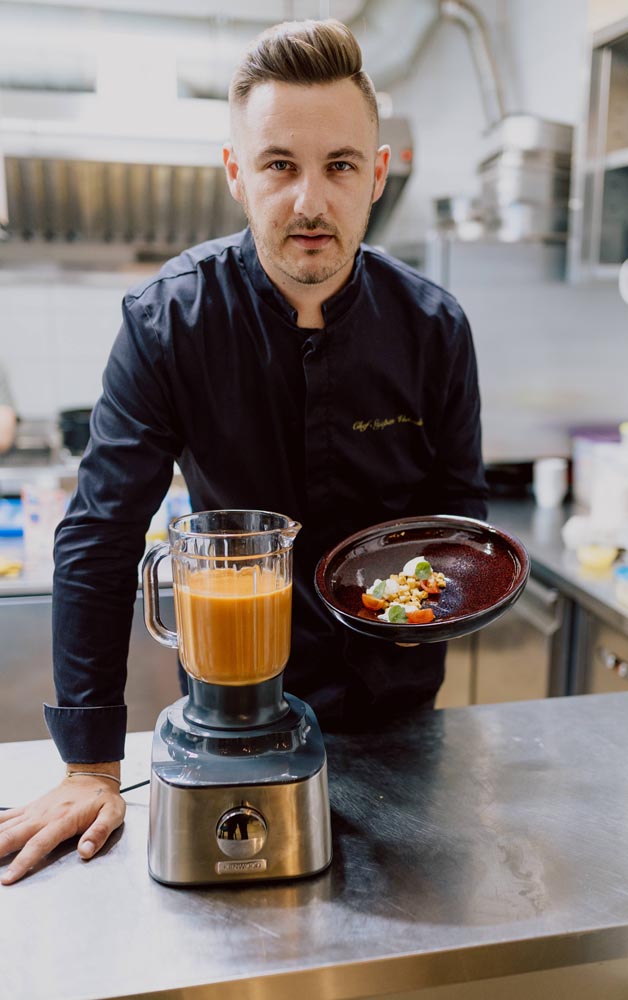 Nakon toga, na istom Kenwood uređaju zamijenio je nastavak za sok i postavio stakleni blender. Sada dolazi najzabavniji i najlakši dio – sve sastojke (sok od rajčice, krastavce, rajčice, pola kruške, celer, crvenu papriku, ljubičasti luk, malo češnjaka, nekoliko listića mente, sok od pola limete, sol, papar i malo šećera) stavio je u blender i izmiksao ih u hladnu, osvježavajuću juhu.