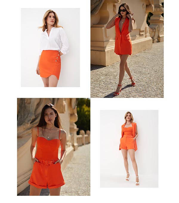 Pomalo retro krojevi koji pričaju priču o svevremenskim komadima koje treba imati u ormaru u kontrastu s ne bojom koja ih stavlja u fokus. Ovaj način nošenja narančaste je potpuno retro (podsjeća na modne 60-te) i idealan je za sve dnevne kombinacije. Posebno obratite pažnju na šik modele kratkih hlača, suknji ili hlača. Kako biste ove komade stavili u fokus – kontrirajte im ne bojom.