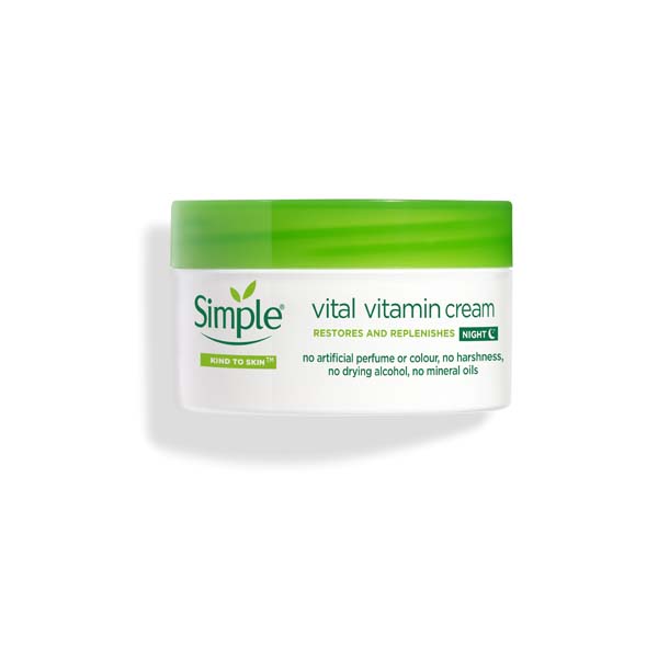 Noćna krema za lice s vitaminima i hranjivim sastojcima, prikladna i za osjetljivu kožu. Sadrži pro-vitamin B5, vitamin E, glicerin, bisabolol i ulje boražine. Bez umjetnih je bojila i mirisa kao i bez alkohola. Proizvod je dermatološki testiran i hipoalergen. Nanosi se uvečer na kožu lica i vrata, uz izbjegavanje kontakta s očima, a za najbolje rezultate potrebno ju je koristiti u kombinaciji sa Simple Kind to SkinTM vital vitamin day kremom za lice.