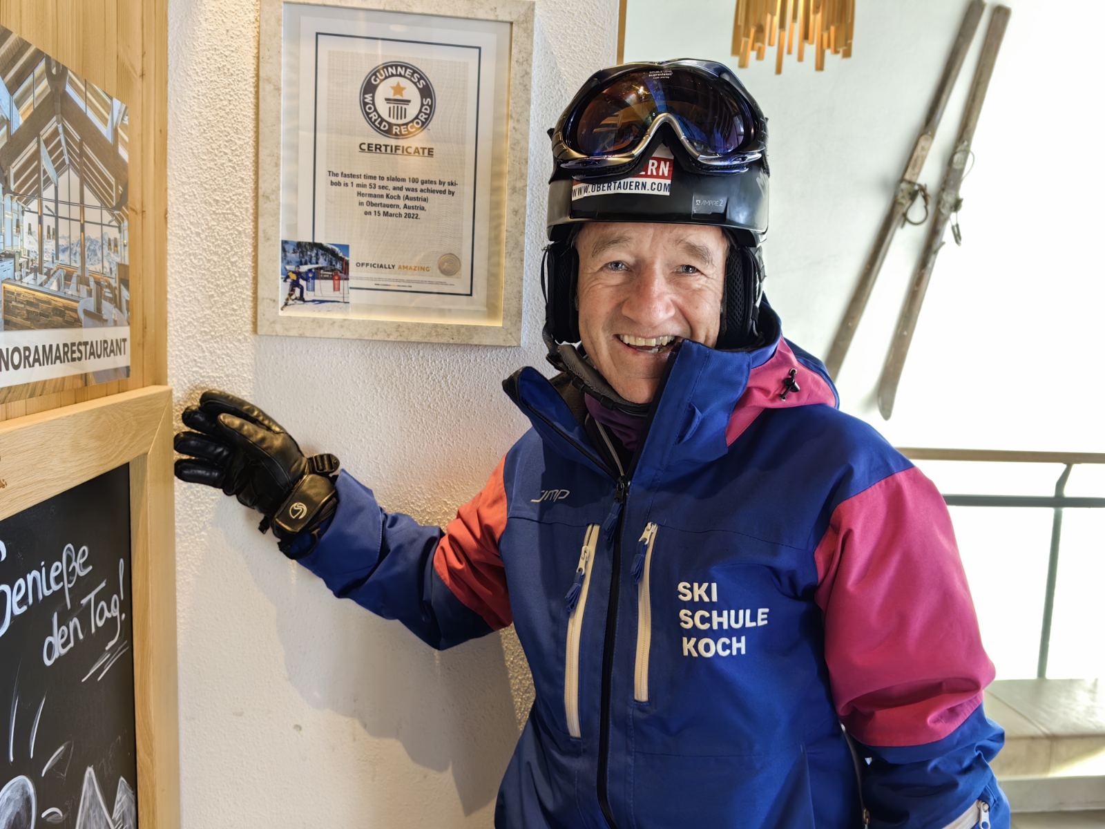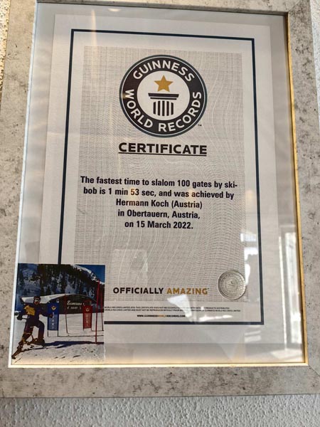 Uspinjući se prema jednom od vrhova kako bismo sjeli u kafić na stazi, ugrijali se i pripremili za drugu etapu skijanja, na zidu prekrasnog Gamsmilchbar Obertauerna primijetila sam veliku, uokvirenu fotografiju s poznatim licem. Bio je to Hermann s uručenom plaketom na kojoj je jasno pisalo da je uvršten u Guinnessovu knjigu rekorda!