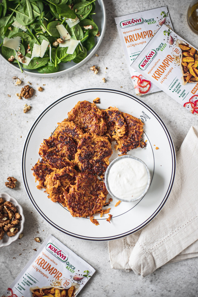 RECEPT: Rösti od batata s hren-vrhnje umakom i salatom od špinata, parmezana i oraha