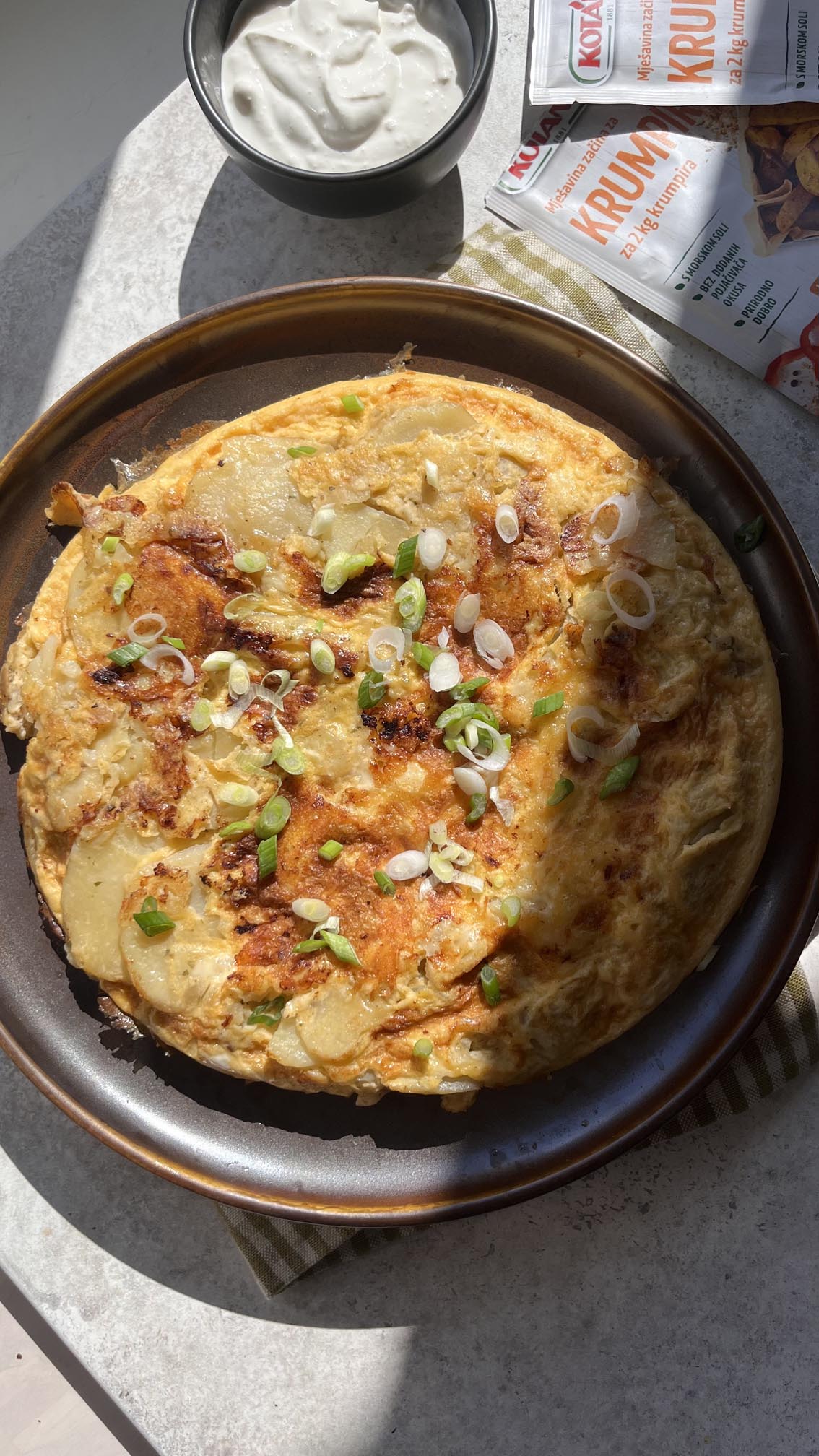 Maknite tavu s vatre i pažljivo špatulom odlijepite dno tortilje, preokrenite je na plitki ravni tanjur i vratite u tavu tako da je sada dolje strana koja je bila gore. Pecite još 5 minuta, maknite s vatre i poslužite uz vrhnje i zelenu salatu.