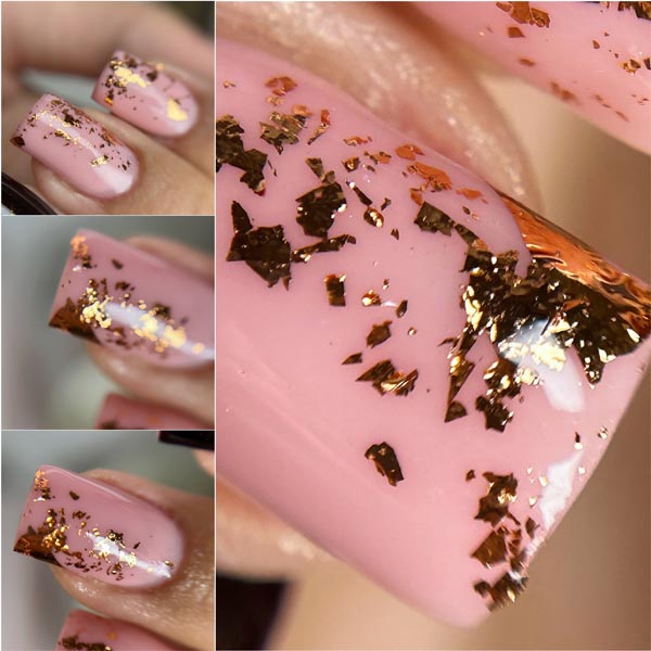 Volite li dašak blagdanskog looka na noktima, ali ne i naslikane Božićne motive, odlučite se za ovakvu eleganciju. Loretta nokat dijeli na pola, kombinira nježno ružičastu i listiće zlata kojima ukrašava određene dijelove nokta.